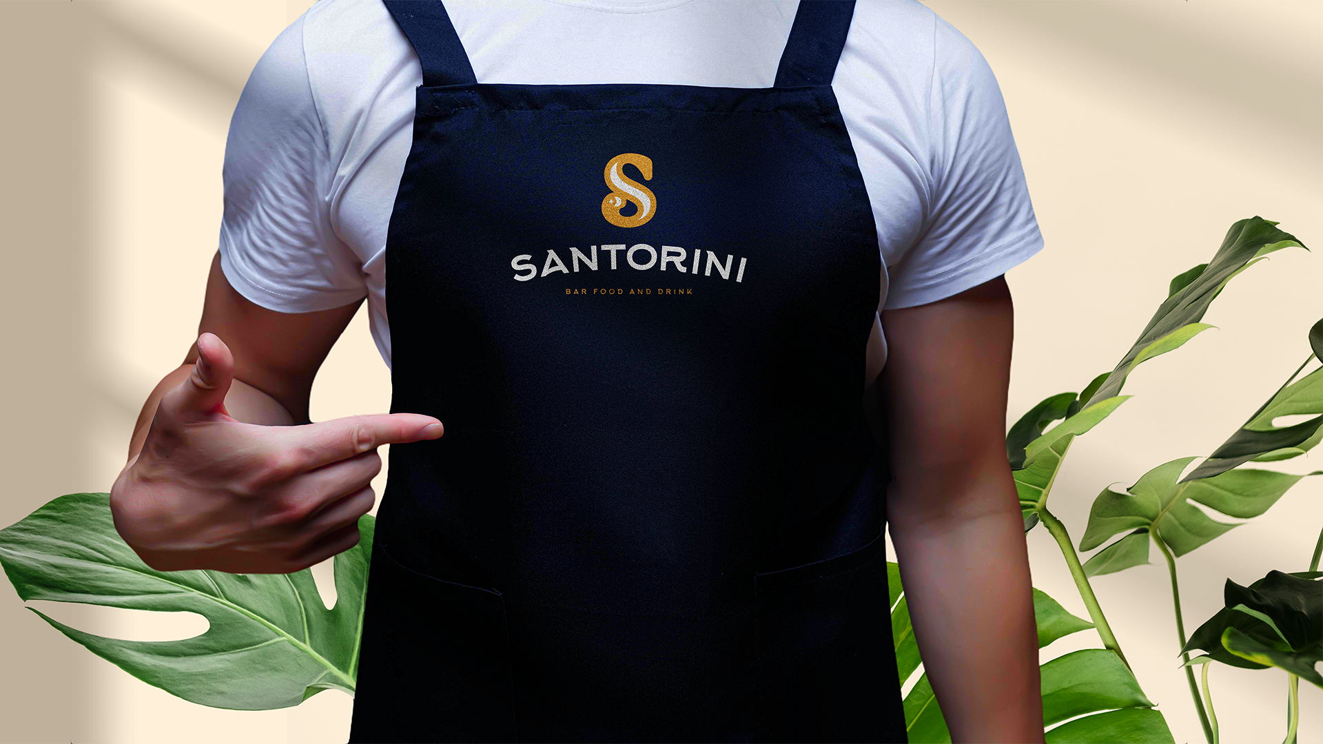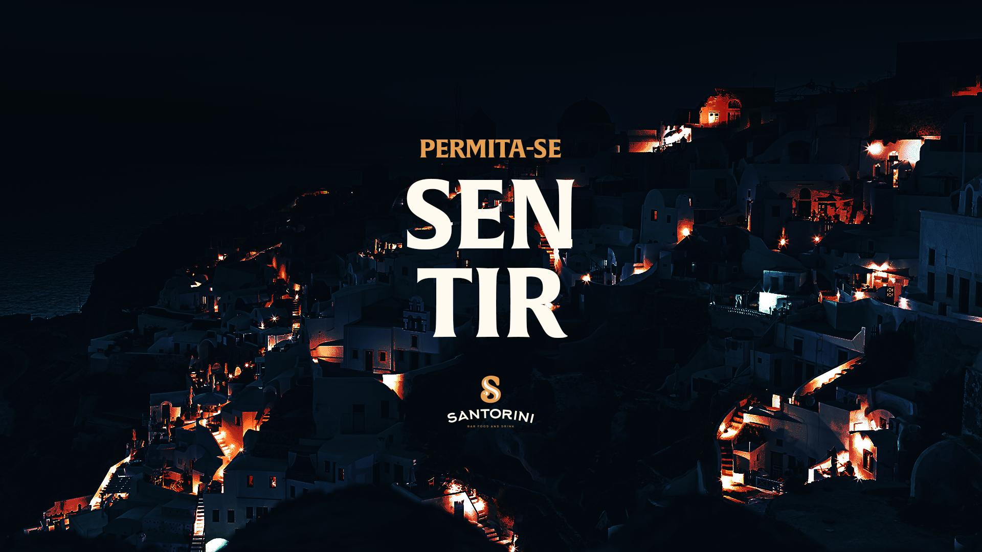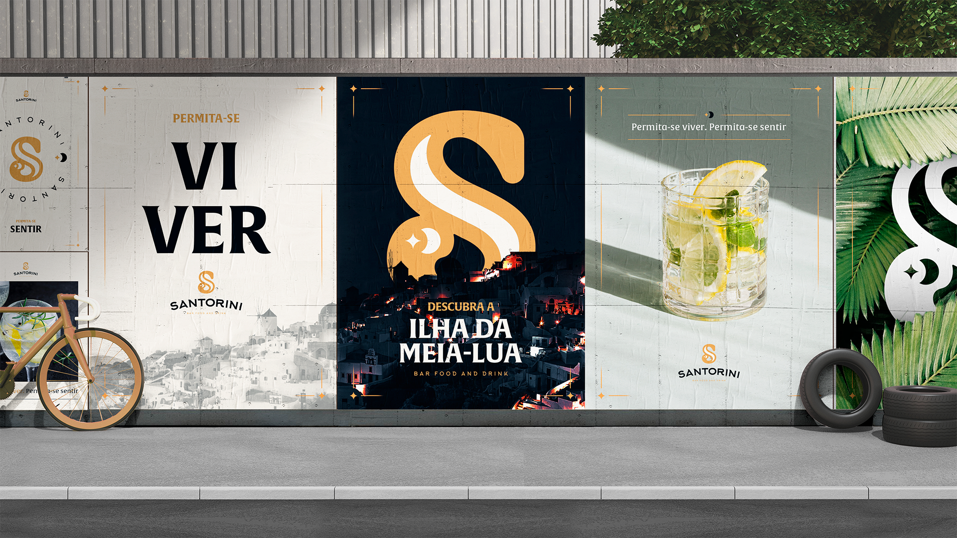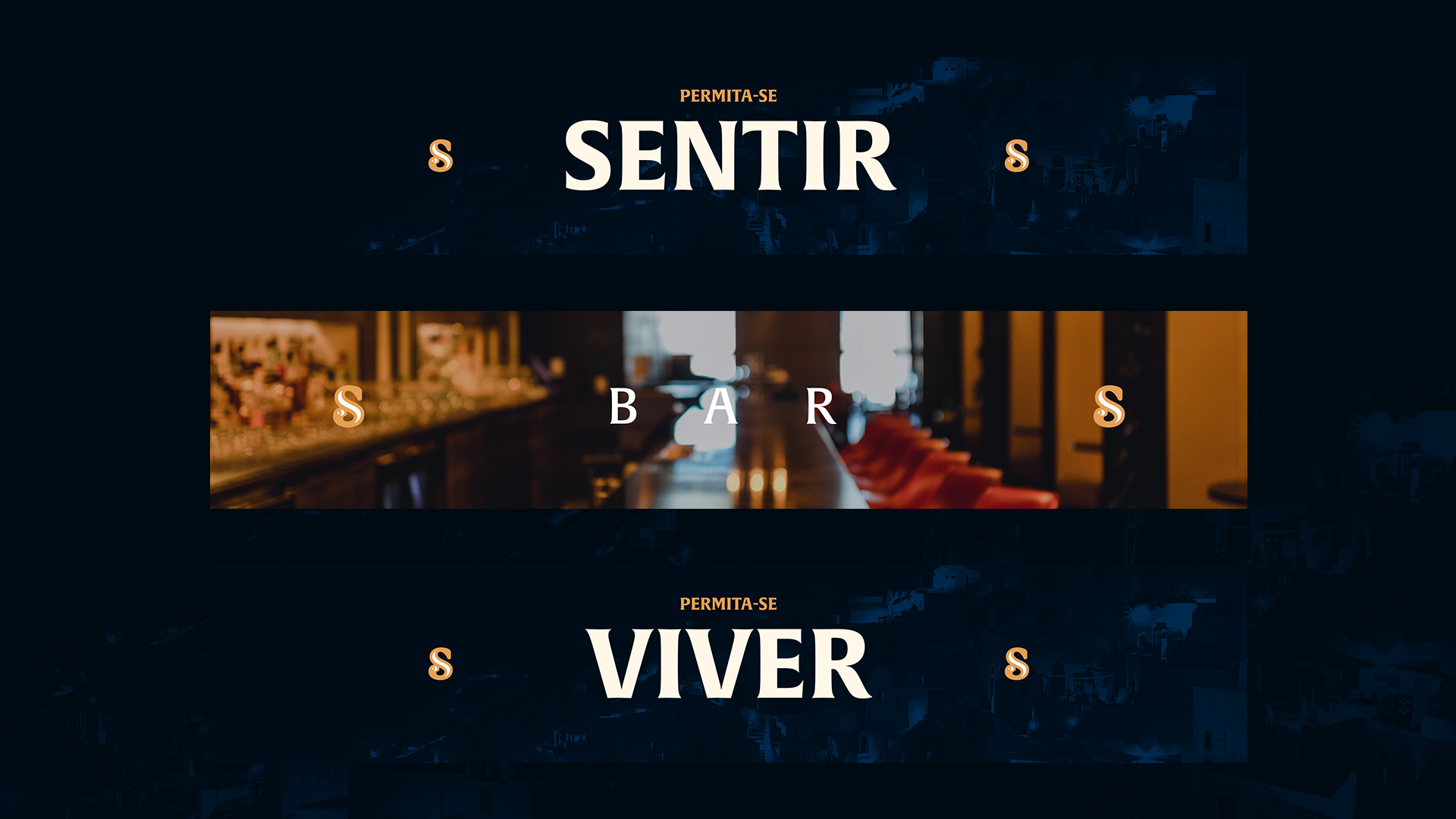 Bar inspirado em Santorini, na Grécia. O ícone em S foi criado inspirado no no nome em que a ilha é chamada: Ilha da meia lua. O amarelo/dourado e o azul marinho trazem a marca elegância.