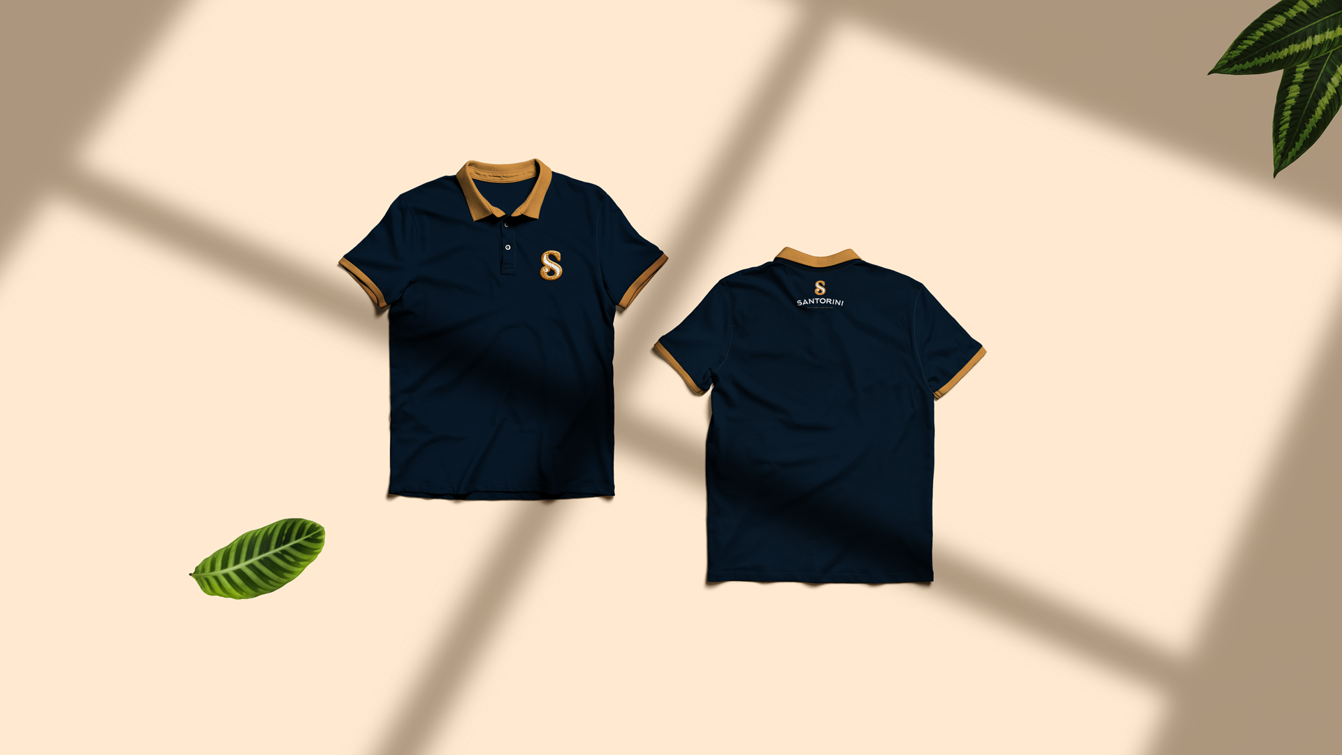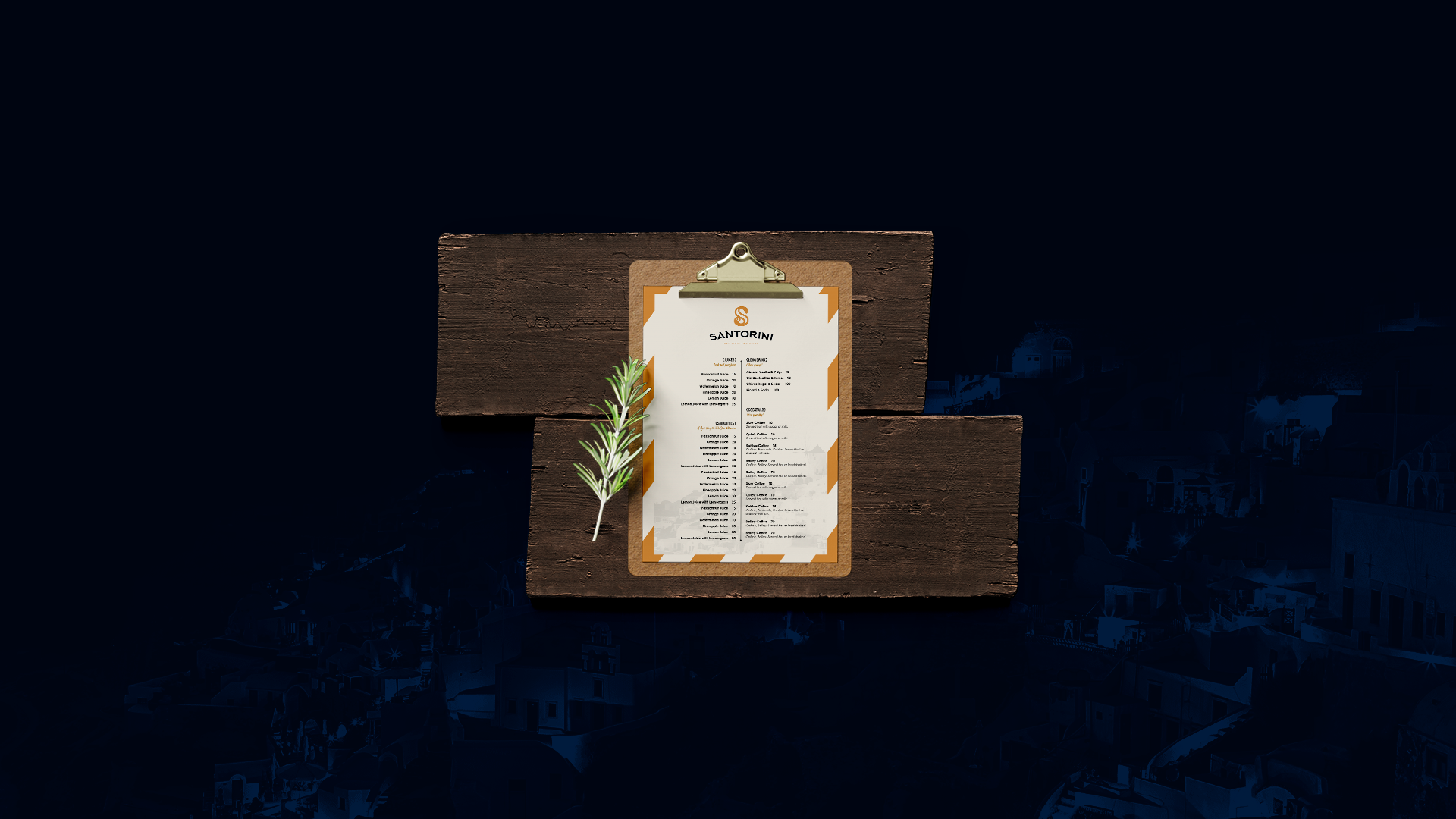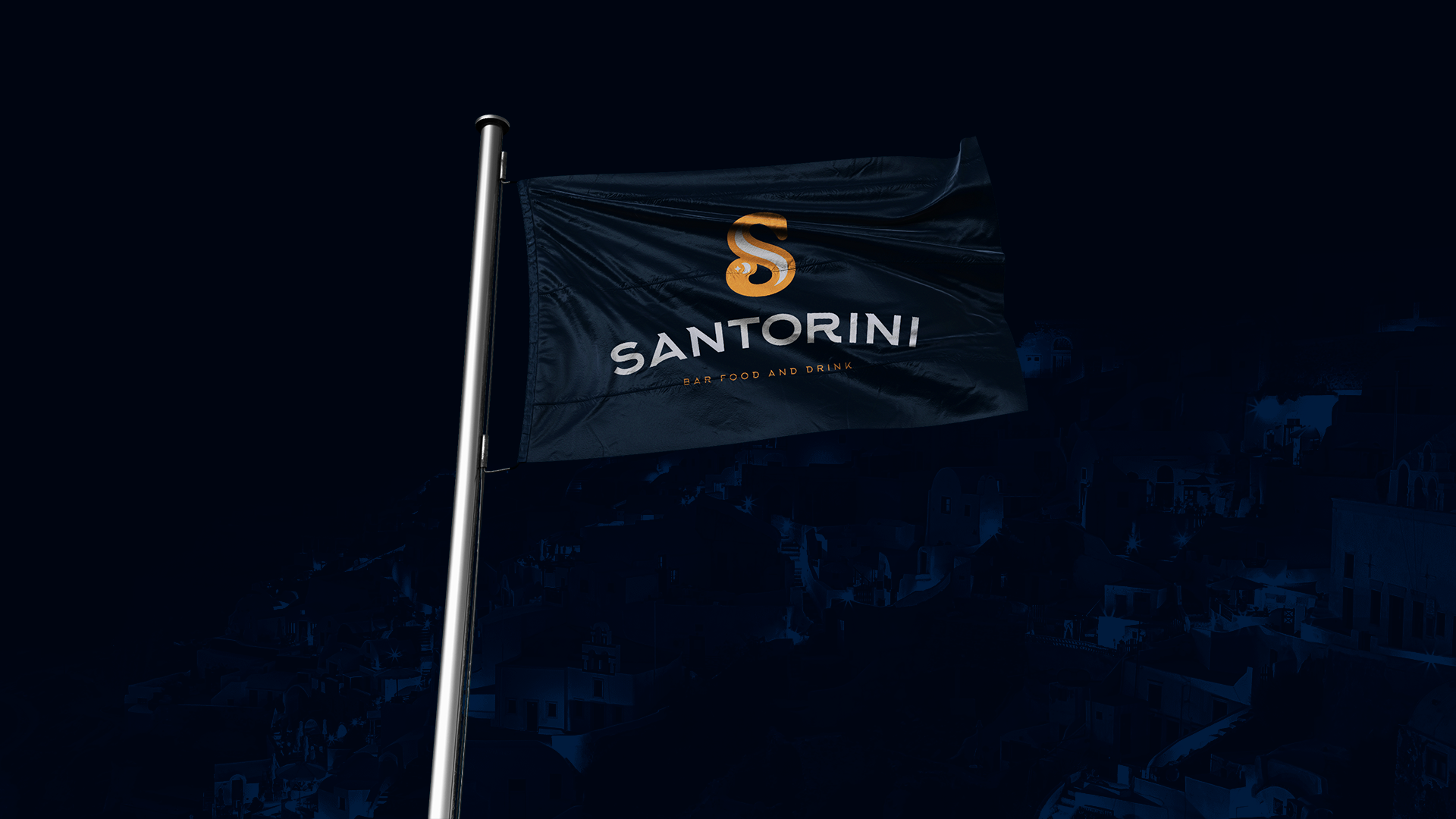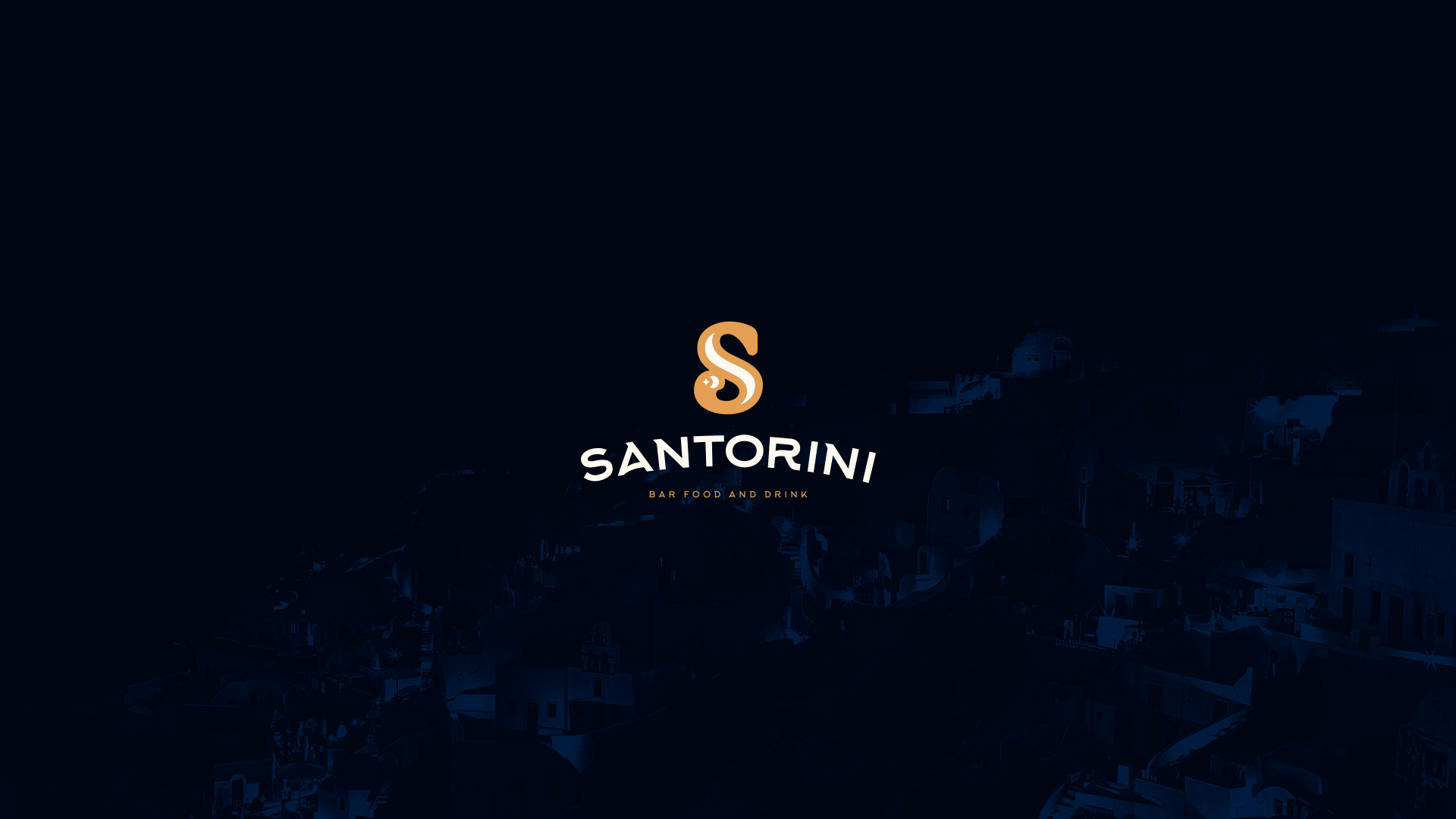 Bar inspired by Santorini, Greece. The icon in S was created inspired by the name in which the island is called: Half Moon Island. Yellow/gold and navy blue bring the brand elegance.
