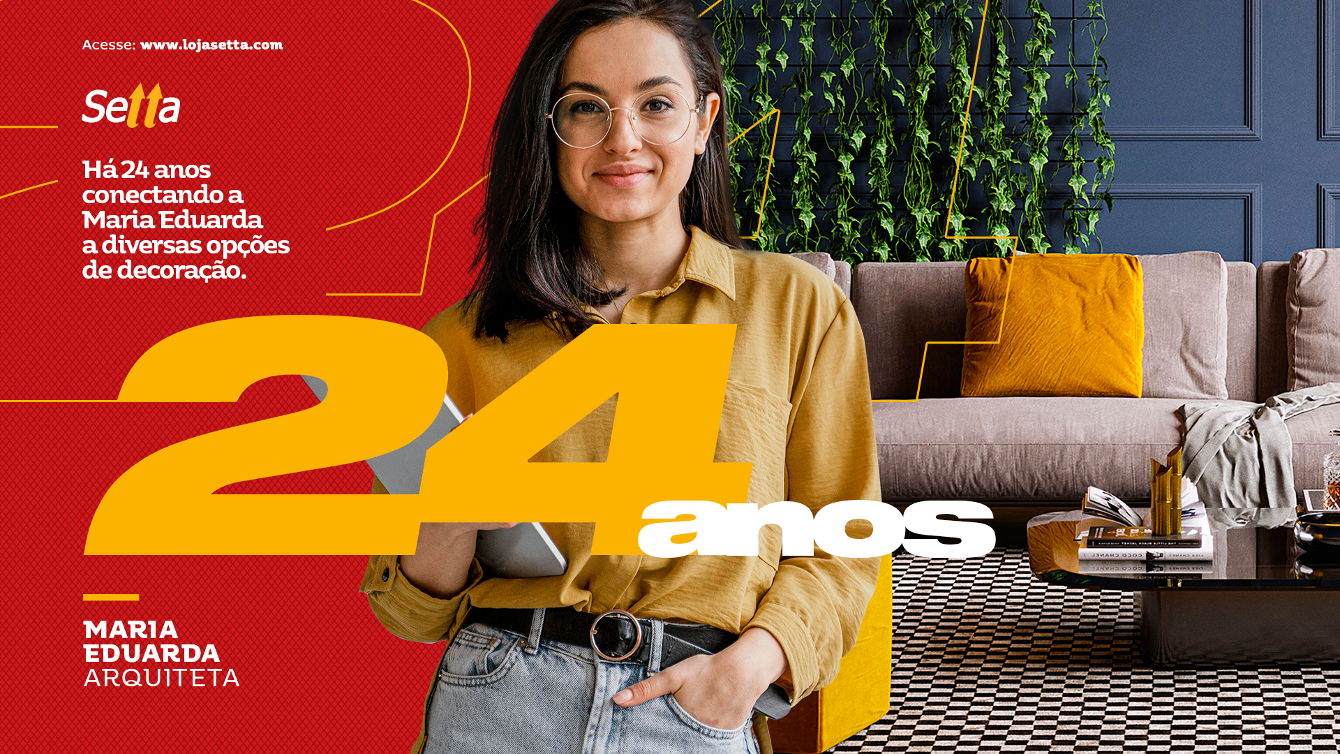 Conceito, direção de arte e redação para anivesário de 24 anos da Setta. Uma empresa que se preocupa em conecetar seus clientes com as melhores soluções em sistemas elétricos para o agronegócio, industrias e design de interior.